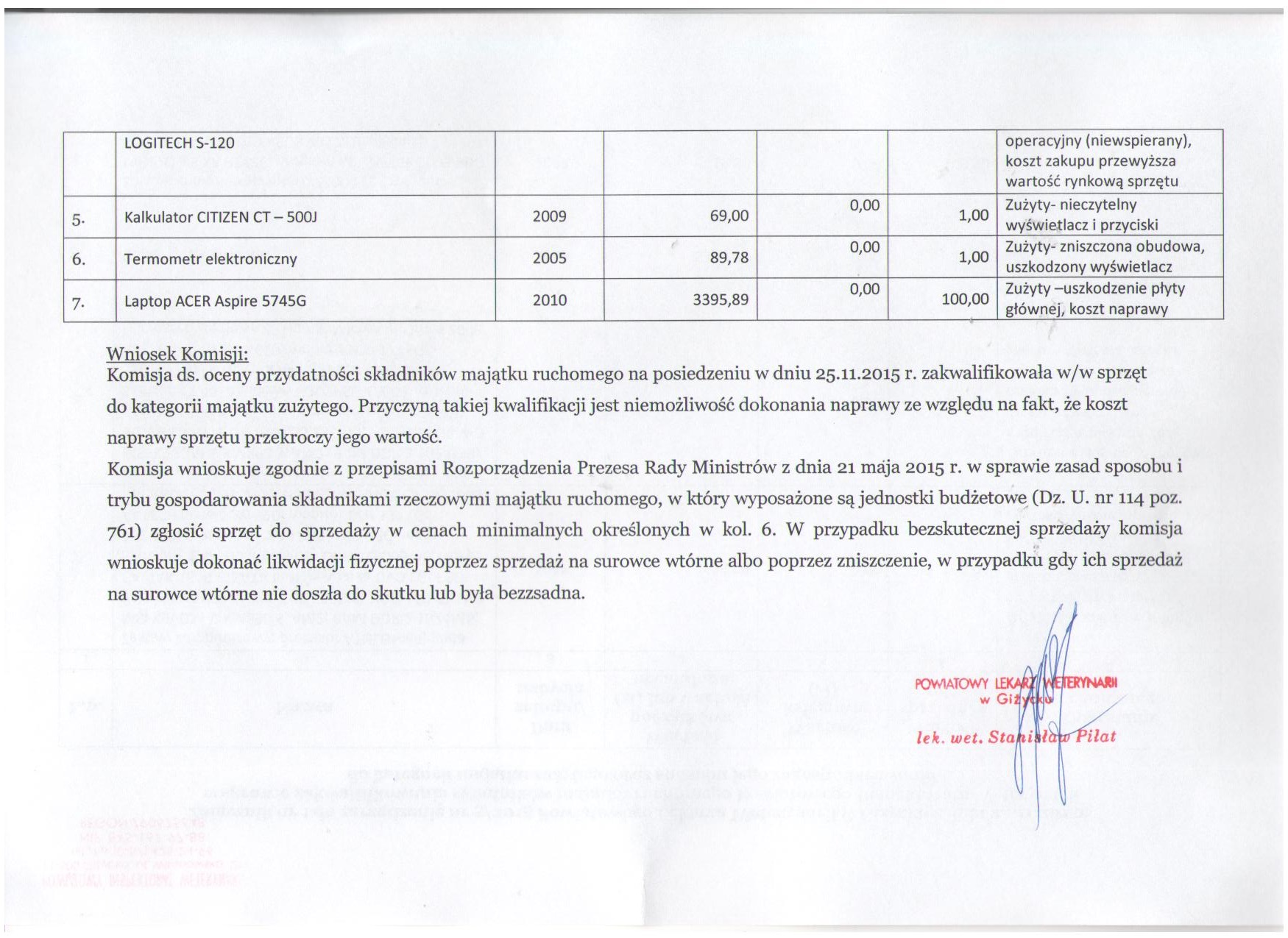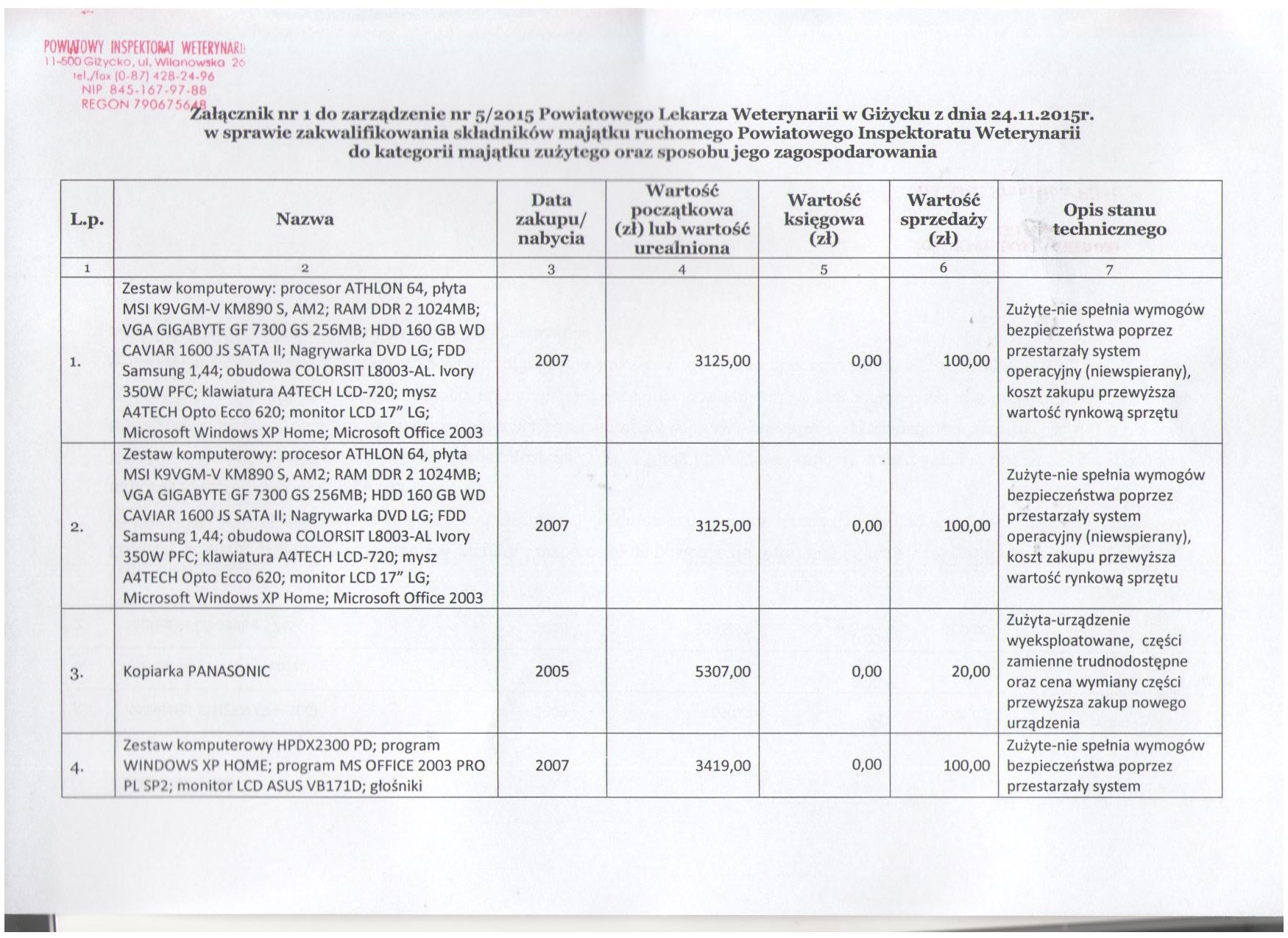 Informuje się, że Powiatowy Inspektorat Weterynarii w Giżycku posiada przeznaczone do zbycia mienie zużyte według załączonej listy.